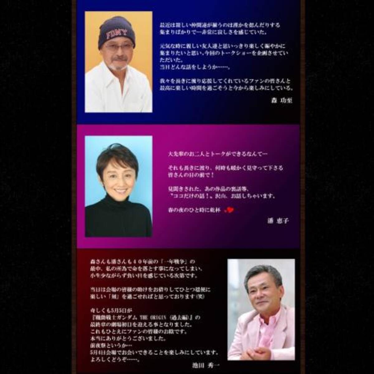 レジェンド声優トークショー一般発売開始 森功至さん 潘恵子さん 池田秀一さんからのメッセージも 18年3月22日 エキサイトニュース